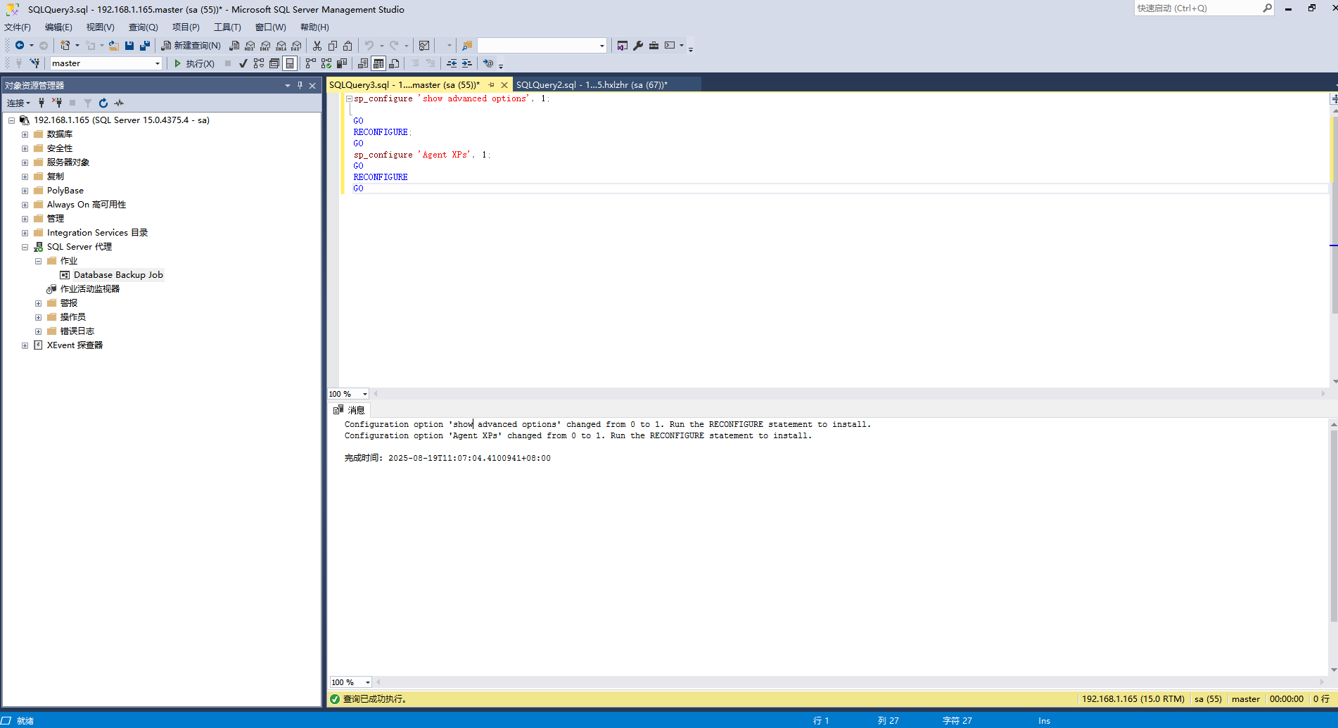 使用SSMS连接上数据库之后执行语句就可开启MSSQL代理