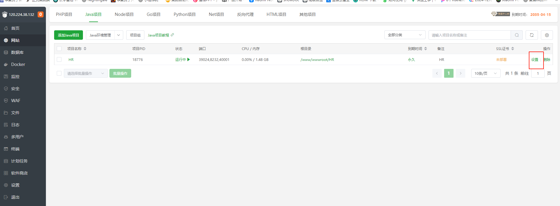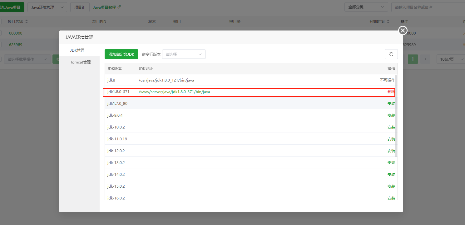 - 4.1 点击网站里面的JAVA项目,里面有一个JDK管理,安装JDK 1.8