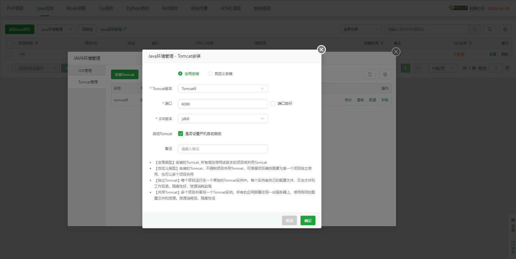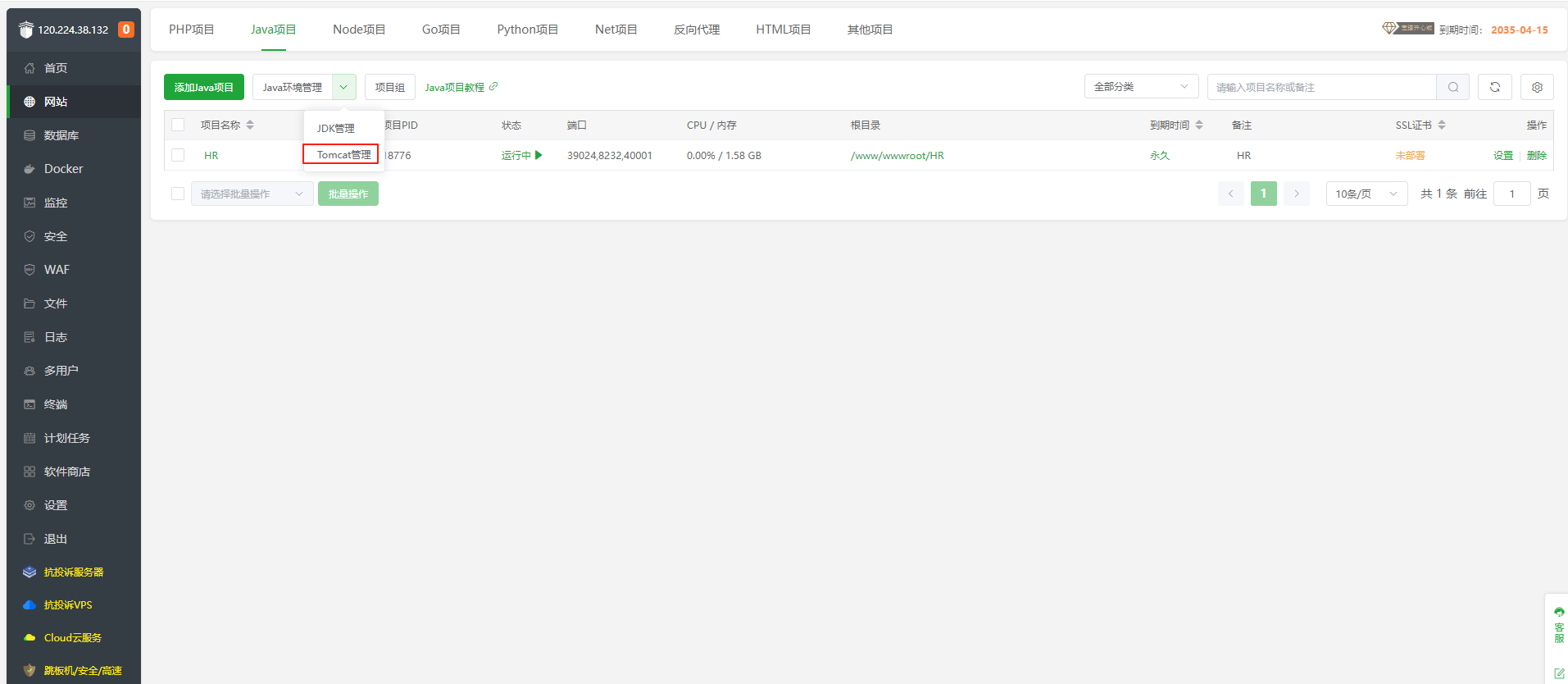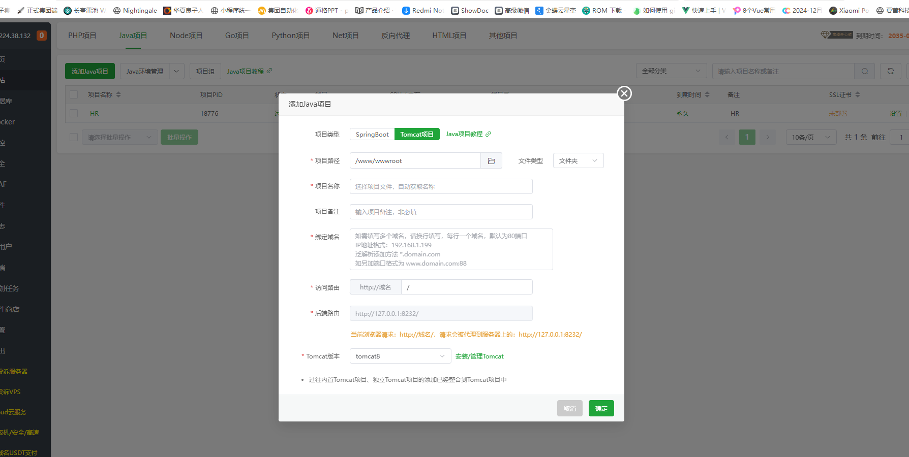 在网站里面的JAVA项目里面添加JAVA项目,选择Tomcat项目,项目路径选择刚刚的文件夹,然后填写一下域名,这个不能进行重复,后面在项目配置里面进行修改(如果不进行反向代理的话)。Tomcat选择刚刚安装的(多个项目可选择不同的Tomcat)