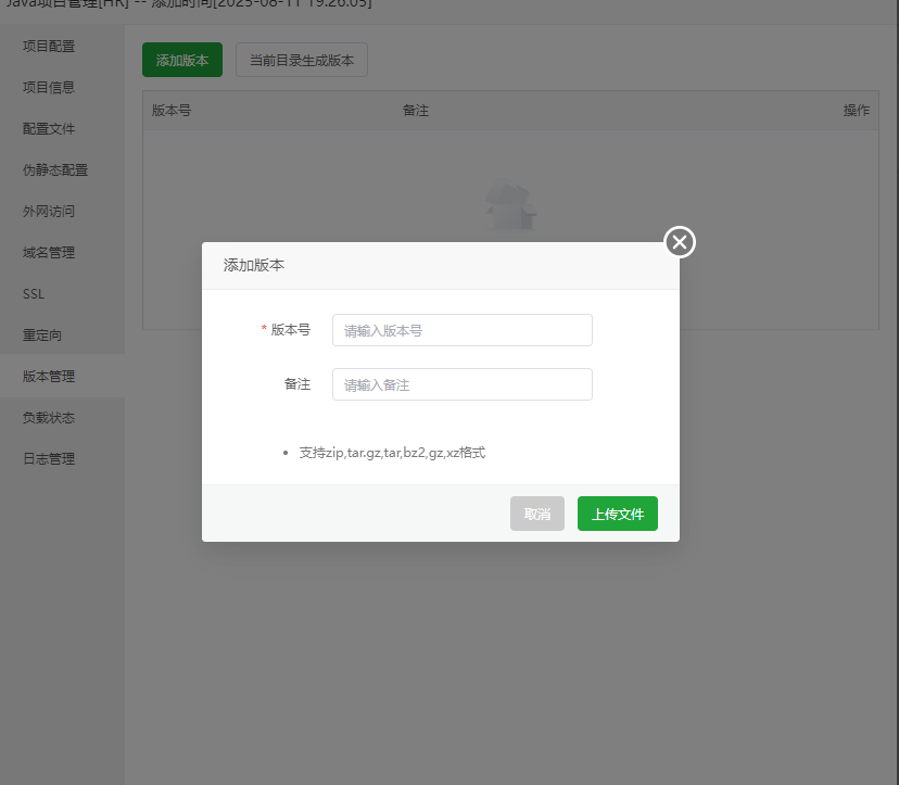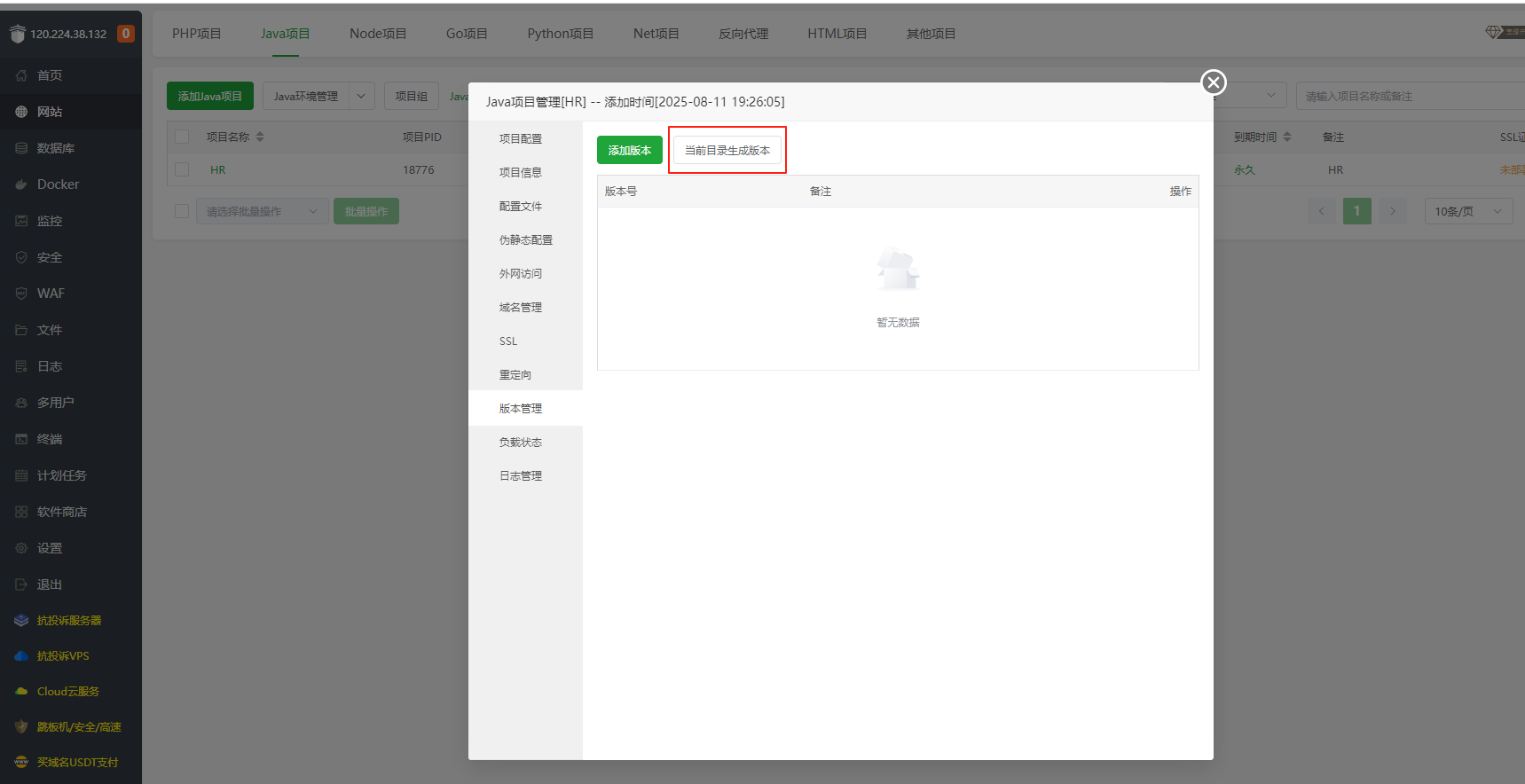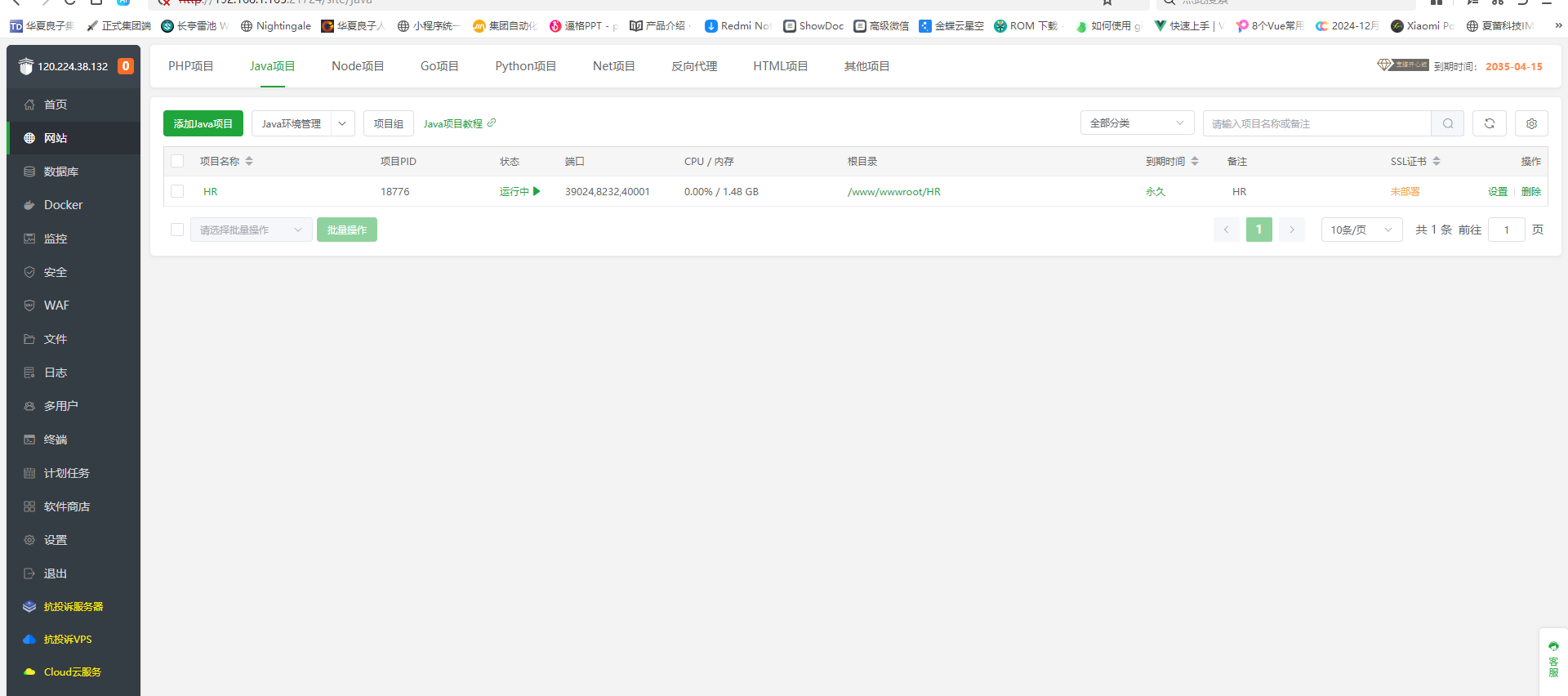 在网站里面的JAVA项目里面添加JAVA项目,选择Tomcat项目,项目路径选择刚刚的文件夹,然后填写一下域名,这个不能进行重复,后面在项目配置里面进行修改(如果不进行反向代理的话)。Tomcat选择刚刚安装的(多个项目可选择不同的Tomcat)