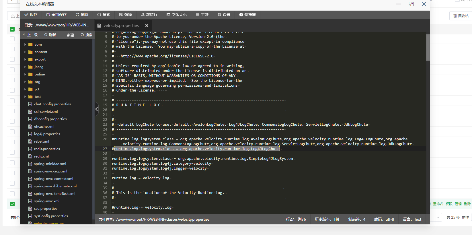 runtime.log = velocity.log进入刚刚创建的目录,在/WEB-INF/classes里面找到velocity.properties进行编辑