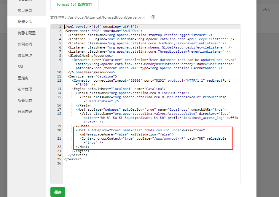 <Context crossContext="true" docBase="/www/wwwroot/HR" path="HR" reloadable="true" />