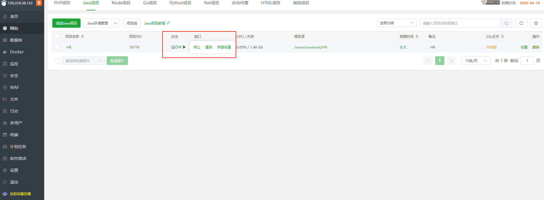 在JAVA主页面的状态里面点击启动或重启(修改了配置就需要重启服务)。