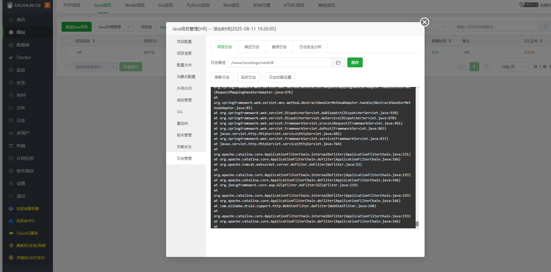 在JAVA项目里面点击设置,有个日志管理可进行查看日志。