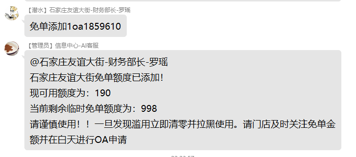 - 免单添加格式为:免单添加XXXoaXXX。