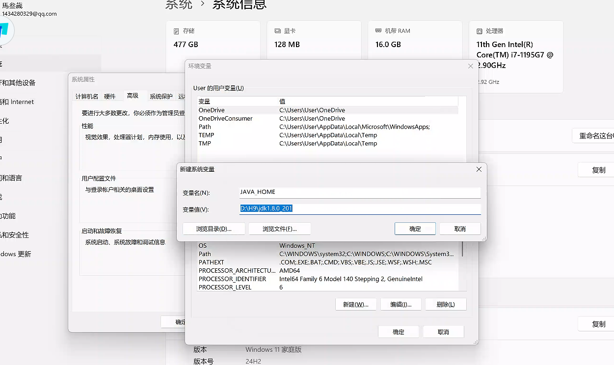3、在弹出的“环境变量”窗口中,点击下方“系统变量”中的“新建”按钮,在弹出的“新建系统变量”窗口中,新建一个名为“JAVA_HOME”的环境变量,变量值为H9系统下JDK的安装路径(一般是D:\H9\jdk_1.8.0_201)