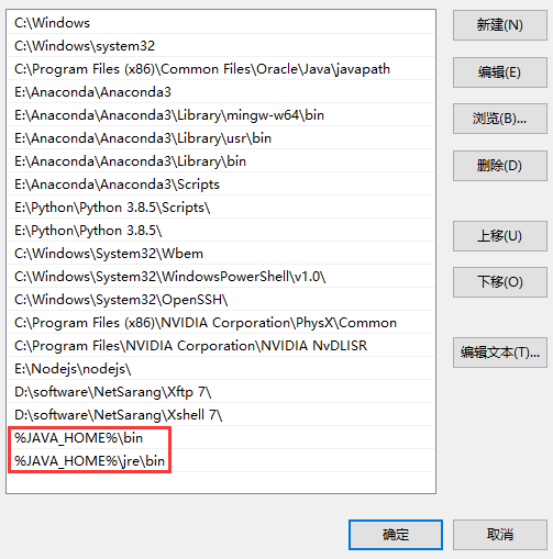 4、设置Path环境变量(该变量已经存在),直接在列表中选择Path,点击下方的“编辑”按钮,然后在弹出的窗口中,点击“编辑文本”按钮,再将“变量值”的末尾添加以下内容:%JAVA_HOME%\bin;%JAVA_HOME%\jre\bin;(或点击新建,分两次添加,第一次添加:%JAVA_HOME%\bin,第二次添加:%JAVA_HOME%\jre\bin)然后点击“确认”按钮即可;正确添加后的效果如下